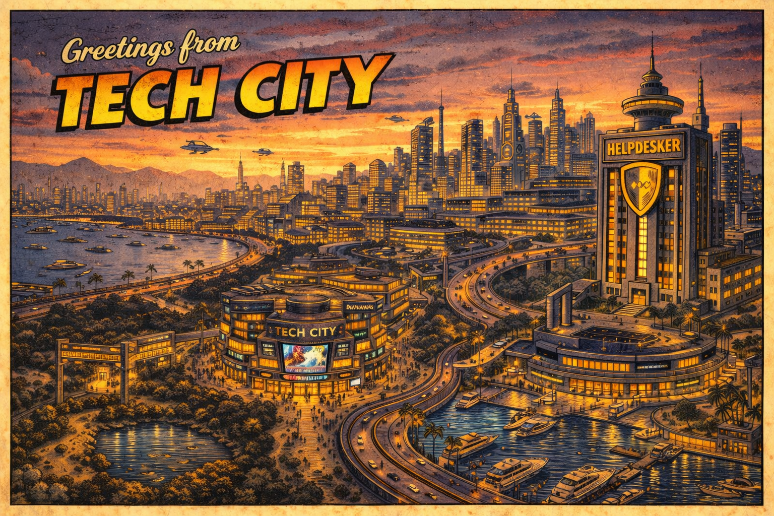At the center of it all is the Helpdesker HQ, rising over the city like a promise, a warning, or a customer service escalation made architectural. It is one of the defining landmarks of Tech City, and like most things here, it manages to look both heroic and vaguely overworked. That is the city in miniature. Tech City is not polished because it is perfect. It is polished because somebody had to get it working again before morning.